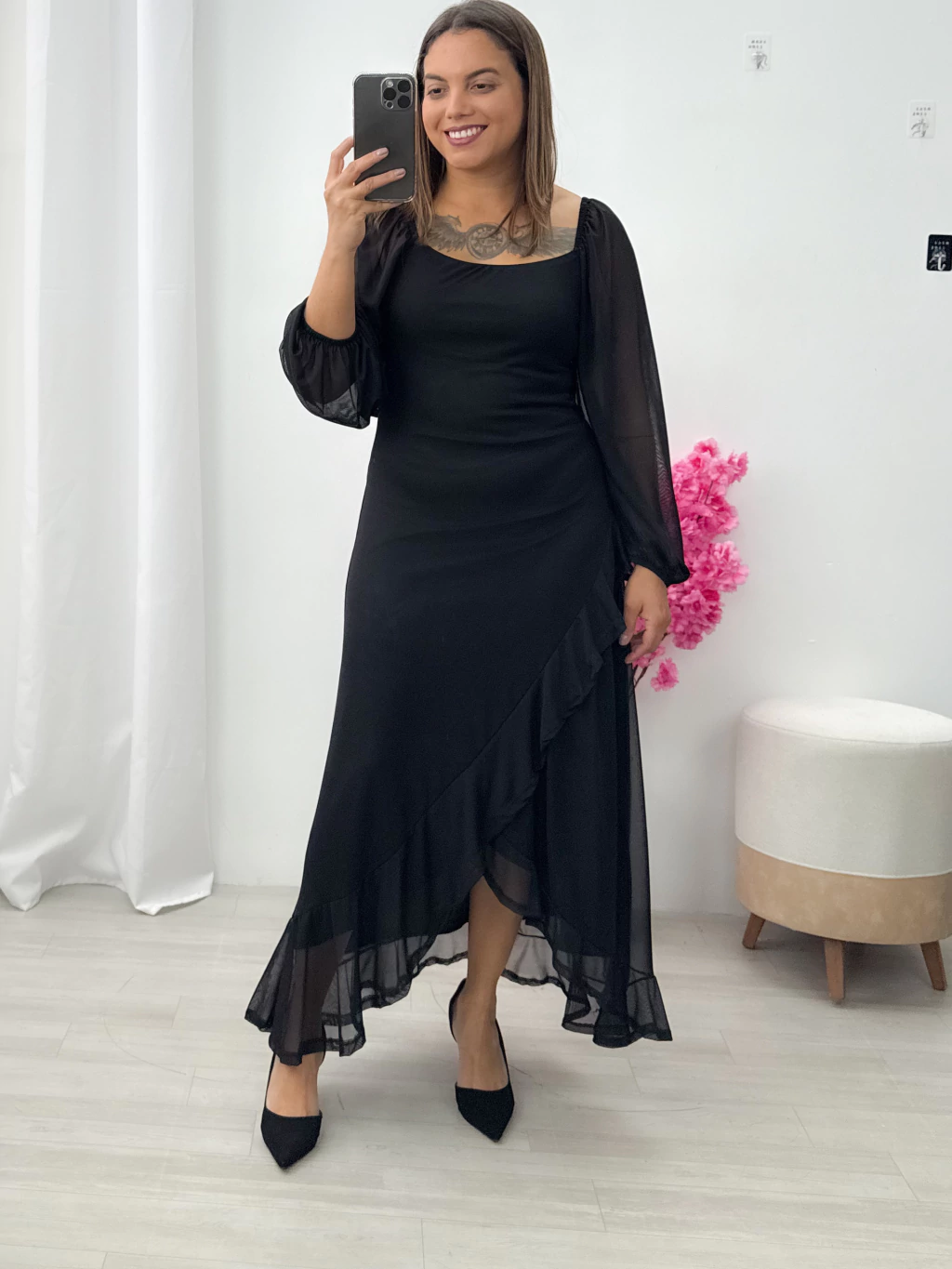 Descubra o charme do Vestido de Tule Preto 24022, confeccionado em 92% poliéster e 8% elastano com forro 100% poliéster, garantindo conforto e elegância.